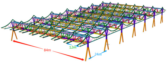 The Zhengzhou New International Convention and Exhibition Center project is located in the Zhengzhou Aviation Port, Henan Province. The site measures approximately 600 m in width from east to west and 970 m in length from north to south. The entire building is a steel structure with a maximum height of 21.03 m (at the highest point of the curtain wall). The exhibition hall’s steel structure is a door-type shelving system composed of space truss beams and herringbone columns, with a structural plane size of 162 m by 84 m. The main truss structure has a height of 19.048 m, a span of 84 m, and a spacing of 24 m. The secondary trusses are spaced 12 m apart. The main structure is shown in Figure 2.