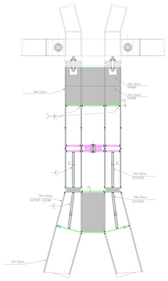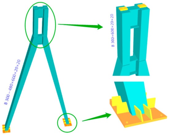 The herringbone column facade model is shown in Figure 3. The top elevation of the herringbone column is 12 m, and the height of the intersection of the two legs of the herringbone column is 9.75 m. The section size at the top of the foundation is 600 mm × 300 mm, the section size at the elevation of 9.75 m is 600 mm × 480 mm, the section size of the superstructure is 600 mm × 300 mm, and the plate thickness is 20 mm. The distance between the neutral axes of the bottom of the two column legs is 6.226 m. The thickness of the stiffening plate inside of the column foot is 30 mm. The connection parts of the components are all in accordance with the requirements of GB50661-2011 [33] “Welding Code for Steel Structures”, and the distribution of welding seams can be seen in Figure 4.