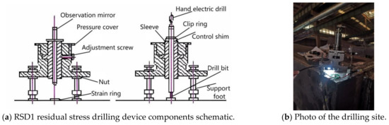 Residual stress can only be locally released by drilling a small hole at the measurement point. As a result, the strain gauge detects a very slight strain value, and a high-precision strain gauge must be used. To continuously improve measurement accuracy, it is necessary to pay close attention to various factors that can introduce errors. The main sources of error include the accuracy of the drilling equipment and the drilling technique, as well as strain measurement errors. Generally speaking, the drilling depth should be greater than 2a. The punching method is shown in Figure 5. Figure 5a is a schematic diagram of the parts of the RSD1 residual stress drilling device, and Figure 5b is a photo of the drilling site.