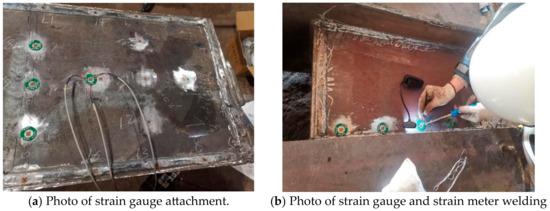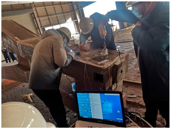 Finally, a drill with a diameter of 1.5 mm is selected for reaming, which can reduce the cutting amount and minimize additional strain. The hole center should be at least 8 times the aperture (12 mm) from the edge of the interface, and the drilling depth should be 1.2 times the diameter of the drill bit, resulting in a drilling depth of 2 mm. When drilling multiple holes for the same specimen for calibration, the distance between holes should be greater than 5 times the aperture. The layout of the measurement points is illustrated in Figure 6. The optimal ratio of hole depth to aperture is 1.0 to 1.2 [34]. Figure 7 presents the site diagram for the welding of the herringbone column.
