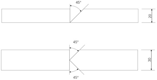 According to GB985-88 [37], “Basic Forms and Dimensions of Gas Welding, Manual Arc Welding, and Gas Shielded Welding Weld Grooves”, as shown in Figure 4, the thickness of the plates used for the H-shaped column is either 20 mm or 30 mm, and the joint groove form is illustrated in Figure 9.