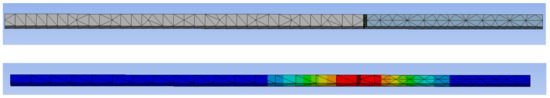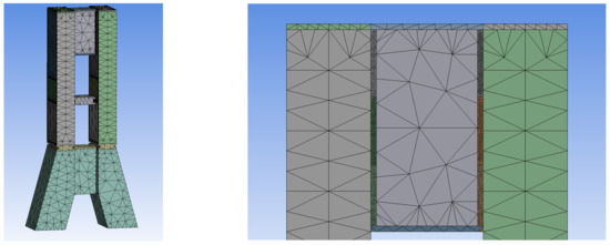 The model is shown in Figure 15. The minimum element edge length is 2.1 mm, and the maximum element edge length is 112.49 mm. As for the mechanical constraints of the model, the base of the column is fixed at the column foot, while the middle cross-section and the top of the column are supported with frictionless supports.