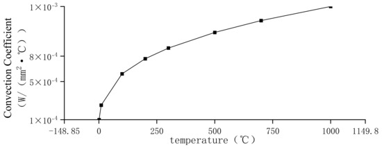 The welding process mainly takes place inside of the workshop, so the environmental temperature is assumed to be 22 °C when considering the heat convection between the plate and the surrounding environment. For metals above 1000 °C, in addition to convection, there will also be some radiation. The thermal emissivity of the Q355B steel used in this study is 0.7. The convection is shown in Figure 11.