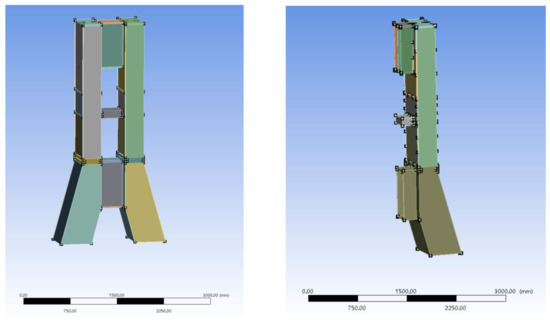 The model consists of 450 geometric elements, which necessitates significant computational resources in terms of time and memory, imposing stringent requirements on the equipment. The calculations are complex and prone to errors. Considering the symmetrical structure of the herringbone column, only half of the structure is modeled, and a sliding support is added to the symmetry axis for restraint. Additionally, as shown in Figure 13, the residual stress in areas farther away from the weld is smaller. Therefore, welding-induced residual stresses in elements situated at heights below 10.5 m are not considered, with the joint being simplified to a solid connection.