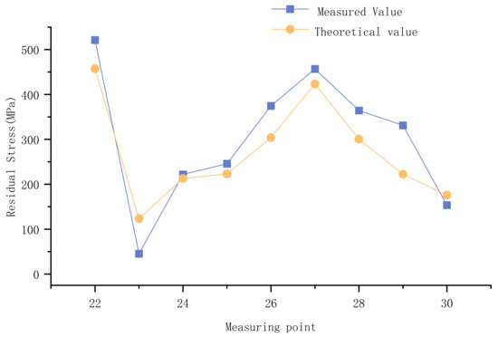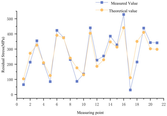 It can be seen from Figure 19 that the measured residual stress shows a consistent overall trend with the numerical simulation results. Both the qualitative comparison of the welding process and the quantitative comparison of the residual deformation using similar methods indicate that the numerical simulation results are relatively close to the experimentally predicted results.