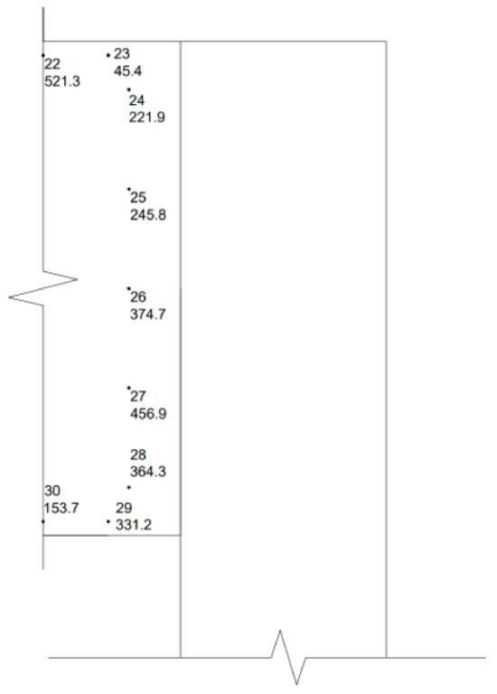 Figure 18 shows the layout diagram of measuring points No. 22 to No. 30 on the herringbone column, along with the measured values of welding residual stress at each point after welding. The residual stress values from measuring point No. 23 to measuring point No. 29 exhibit a trend of first increasing and then decreasing. This phenomenon occurs as the horizontal constraint does not change, but the vertical constraint demonstrates an initial increase followed by a decrease.