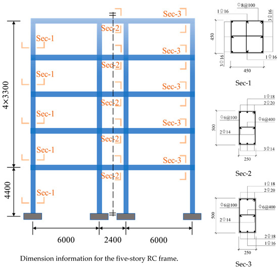 34]. In OpenSees, Concrete01 and Steel02 were selected to build the models. The P-delta effect was considered when the columns were modeled by using fiber nonlinearBeamColumn elements. All beams and columns of the structure were constructed using C30 concrete and HRB33 longitudinal reinforcement. Taking a five-story reinforced concrete frame structure as an example,