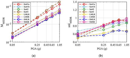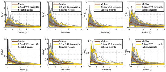 There are 80 unscaled horizontal ground motion records in each set of Set1a, Set1b, Set2, and Set3. The horizontal response spectra of these records were matched to the predicted median and log standard deviation of the scenario earthquake. For Set1a, the relevant parameters of the scenario earthquake are a magnitude M of 7, a distance R of 10 km, a strike-slip earthquake, and site VS30 (average shear wave velocity in the top 30 m) of 250 m/s. For Set1b, the relevant parameters of the scenario earthquake are magnitude M of 6, distance R of 25 km, strike-slip earthquake, and a site VS30 of 250 m/s. For Set2, the relevant parameters of scenario earthquake are a magnitude M of 7, a distance R of 10 km, a strike-slip earthquake, and a site VS30 of 760 m/s. For Set3, there are 80 unscaled ground motions containing strong velocity pulses with different pulse periods between 1.0 and 12.9 s, and an average value of 5.5 s. These four sets are not specific to a specific site and structure. The primary period range of these ground motion records was between 0 and 3 s, with secondary periods up to 5 s, covering the fundamental period for all structures in this paper. These four sets have ground motions with a variety of spectral shapes, which can obtain the variability of structural demand by these ground motions. It is helpful to identify the trend of the structural response as a function of the intensity parameter of the ground motion, which can be used to analyze the probability distribution and statistical result of the structural response. There are 40 ground motion records in each set of LMLR, LMSR, SMLR, and SMSR, and these records are, respectively, from the earthquakes with large magnitude and large distance (LMLR, 6.5 < Mw < 7.0, 30 < R < 60 km), large magnitude and small distance (LMSR, 6.5 < Mw < 7.0, 13 < R < 30 km), small magnitude and large distance (SMLR, 5.8 < Mw < 6.5, 30 < R < 60 km), small magnitude and small distance (SMSR, 5.8 < M < 6.5, 13 < R < 30 km). The selection of these four sets of ground motion records focused on magnitude and distances, without considering response spectra of ground motions and the site conditions as the four sets aforementioned.
