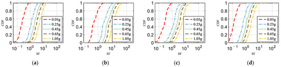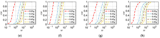 In order to evaluate the probability distribution of the amplitude scaling factor (SF) under different intensity levels, its cumulative distribution function (CDF) was calculated. The results are shown in