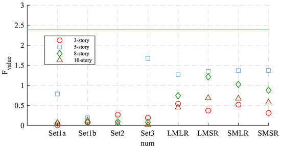 F values for the five-story structure are larger, and the distribution is relatively discrete, and the F values of other structures are relatively concentrated. In general, all structures have F values below the F critical value. A lower