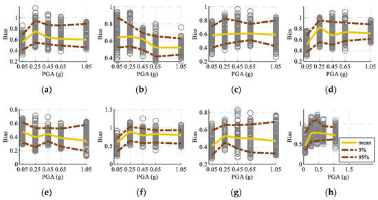 F value indicates that the within-strip variability of the ground motion record set has a greater effect on the total variability than the inter-strip variability. It can be considered that the results of different ground motion record sets confirm that different strips have no significant impact on the mean value of amplitude scaling bias. Thus, it can be concluded that the differences in demand biases within different strips are statistically insignificant, with a confidence level of 95% for all structures, as well as all ground motion record sets used in this study.