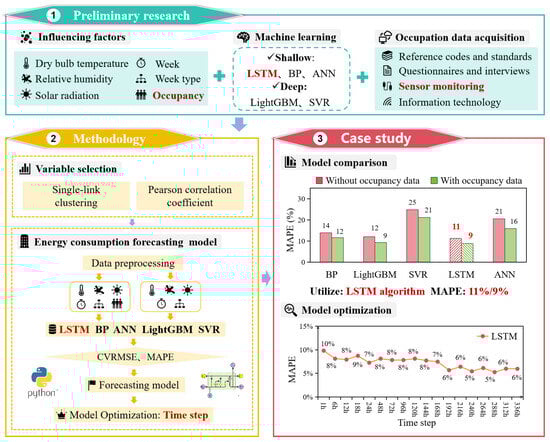 There is a strong correlation between building energy use and outdoor meteorological parameters. Approximately 60% of the research reviewed used meteorological data to predict building energy use []. In addition, studies have shown that occupancy information is also a critical factor influencing energy use, sometimes even more important than meteorological data [,]. The occupancy rate and the human behavior in the building not only affect the internal heat gains, but also affect the use patterns of the energy system [,,]. There is often a significant discrepancy between predicted and actual energy consumption, mainly due to the influence of the occupants [,]. Existing studies have shown an increase in occupancy rate following building energy retrofits with green office buildings increasing by around 2–4% [] and as much as by 16–18% for ordinary office buildings []. In addition, due to the high level of uncertainty and complexity of human behavior, existing simulation tools often adopt standardized timetables and conservative assumptions to solve this uncertainty, leading to a misestimation of energy demand [,]. In addition, the primary use of building simulation is for complex systems analysis rather than accurate long-term forecasting []. Existing studies have pointed out that the lack of accurate real-time occupancy data makes data-driven modeling a challenge []. Therefore, it is important to delve deeper into occupation-related data and explore their potential for modeling based on intelligent algorithms.