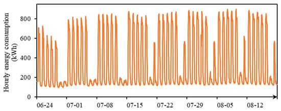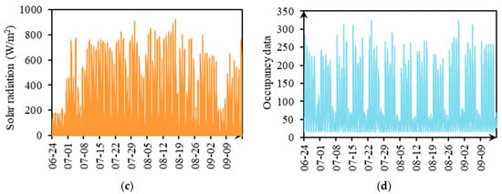 The case building is an office building located in Shanghai, covering a construction area of 29,000 m2. Data were collected from the building over 84 days from 24 June to 15 September 2013 using the data collection methods described in Section 3.1. The data collection period excludes statutory holidays. The historical data gathered includes hourly energy consumption, occupancy, and weather information. The above data was preprocessed by filling missing values and using outlier detection. In addition, the frequency of the data collection was different, but the start and end dates were the same. Thus, the data was processed into hourly frequency after the above data cleaning. Specific data were obtained as shown in Figure 2 and Figure 3.