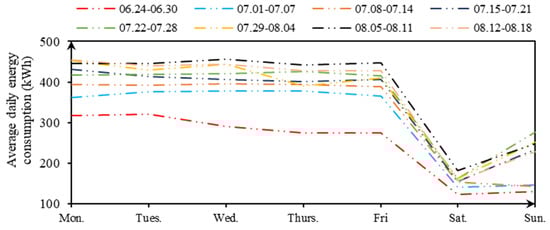 The hourly energy consumption data for 8 weeks from 24 June to 18 August was selected from the data source to build the model. These data are shown in Figure 3. It can be seen that energy consumption has the characteristics of periodic changes by day and week. The eight weeks of energy consumption data are calculated as daily averages and plotted in Figure 4. The weekly variation of energy consumption in office buildings has high weekday and low weekend characteristics. Although the data were collected during the summer, the outdoor temperatures from 24 June to 30 June ranged between 22 °C and 25 °C. This resulted in low air conditioning use and significantly lower energy consumption than other weeks.