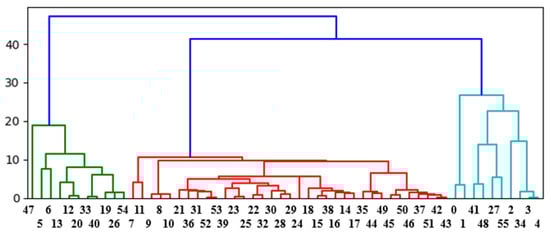 Single link clustering was used to cluster the average daily energy consumption data, and Python (Python3.8, Python Software Foundation, Holland) was applied to calculate the results, as shown in Figure 5. The horizontal coordinates of the graph are the daily serial numbers from 24 June to 18 August, from number 0 to number 55, representing 56 days in 8 weeks.