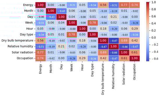 To simplify the model inputs, the correlation between energy consumption and input variables was analyzed using Pearson’s correlation coefficient method, calculated using Python (Python3.8, Python Software Foundation, Holland). The results of the correlation analysis are shown in Figure 6, and they demonstrate that solar radiation, occupancy, and dry bulb temperature are the main influences on energy consumption; week and day type have a fair correlation with energy consumption; and month, day and hour have a weak correlation with energy consumption. This is because the study was only conducted for the summer season, energy consumption does not vary much by month and day, and fluctuations in meteorological and occupancy over time can characterize fluctuations in temporal data. As can be seen above, the variables with a weak correlation were rounded off, and dry bulb temperature, relative humidity, solar radiation, occupancy, week, and day type were selected as inputs to the model. To investigate the influence of occupancy on the prediction results, two different sets of input variables were set up. The first set includes five variables related to time and meteorological parameters. The second set includes six variables related to time, meteorological, and occupancy parameters.