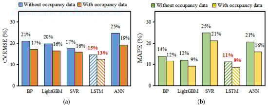 (3) By comparing the LSTM, ANN, BP, LightGBM, and SVR algorithms, it was found that the LSTM algorithm achieved the highest accuracy. The LSTM algorithm was applied to construct the model. The results indicate that the MAPE of the prediction without occupancy was 11%, and the MAPE of the prediction with occupancy was 9%. After considering the occupancy, the accuracy of the model was improved, and accuracy improvement for each day type was 1% (type 1), 4% (type 2), and 7% (type 3);