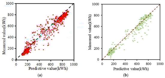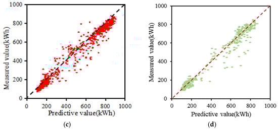 As shown in Table 2, the mean absolute percentage error (MAPE) and coefficient of variation root mean squared error (CVRMSE) are commonly used to evaluate model performance [,]. The study employed CVRMSE to evaluate the model’s fitting and MAPE to assess the accuracy of model predictions. The principle is as follows:
