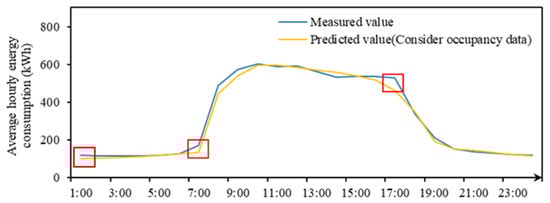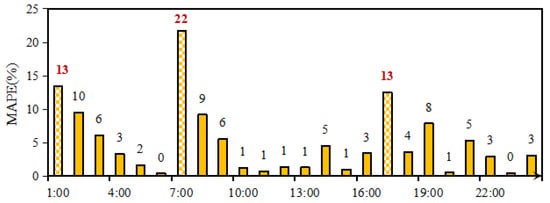 Based on a forecasting model incorporating occupancy data, reasons for large errors were analyzed. The predicted and measured values at each moment were time-averaged. As shown in Figure 9, the difference between the predicted and measured values of energy consumption is greater at 1:00, 7:00, and 17:00. The MAPE at each time point was averaged and the results are shown in Figure 10, which gives a MAPE of 13% at 1:00, 22% at 7:00, and 13% at 17:00. The larger error at 1:00 is because the model predicted at a time step of 1 h, which was the starting point of the prediction, and after completing a day’s prediction, the model automatically jumped to 1:00 the following day, which was influenced by the model itself. The large errors at 7:00 and 17:00 are because this was commuting time when there are large staff changes and complex behaviors, resulting in large fluctuations in energy consumption and insufficient model learning.