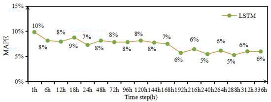 To enhance the learning ability of the model, the model was optimized by varying the time step. The model made several predictions at different time steps and averaged the predicted values to obtain the MAPE for 1:00, 7:00, and 17:00 at different time steps, as shown in Table 6. It is evident that as the time step increased, the MAPE at the three time points decreased. For the moments 1:00, 7:00 and 17:00, the best optimization of the model was achieved when the time step values were set to 6 h, 24 h and 18 h with a MAPE of 3%, 6% and 5%, respectively. The overall MAPE for different time steps is shown in Figure 11. It can be seen that as the time step increases (up to 2 weeks), the accuracy of the model decreases to 6%.