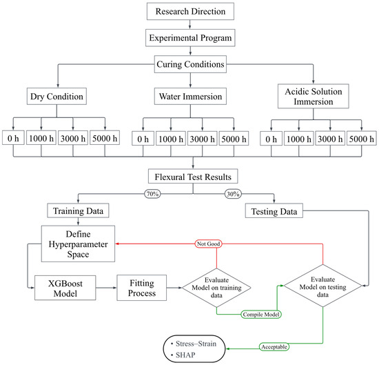 The research undertaken in this study encompassed two primary components. Firstly, a series of mechanical tests were conducted on lime-based mortar specimens subjected to varying testing ages and exposure conditions. Secondly, a data-driven machine learning modeling approach was employed to predict the stress-displacement behavior of a commercially available lime-based mortar. The model considered aging parameters in acidic environments, with different exposure times, to provide insights into the mechanical performance of the mortar over time. This section provides a comprehensive exposition of the experimental campaign, detailing the materials utilized, the methodology employed for specimen preparation, the conducted testing procedures, and an elucidation of the modeling methodology. Figure 1 outlines the experimental program and machine learning methodology used to predict the stress values of lime-based mortar under different curing conditions. The framework begins with the research direction, guiding the experimental program’s design, which encompasses the following curing conditions: dry condition, water immersion, and acidic solution immersion. Each of these conditions is tested at multiple exposure times (0 h, 1000 h, 3000 h, and 5000 h) to understand the material’s behavior over time. The experimental data obtained from flexural tests is randomly divided into training and testing datasets, with 70% allocated for training (20,000 observations) and 30% for testing (8500 observations). During the fitting process, the model is trained and evaluated on the training data to optimize the model’s hyperparameters. Once the desired model’s performance on the training data is obtained, the model is evaluated on the testing data to ensure its generalizability and robustness.