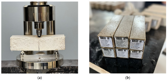 Flexural testing of lime-based mortar specimens under varying environmental conditions and exposure durations. (a) Three-point bending test setup. (b) Prepared mortar specimens prior to testing.