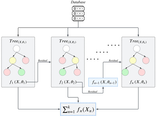 The XGBoost algorithm, illustrated in Figure 3, is an advanced implementation of gradient boosting that enhances performance and speed. This ensemble learning method involves constructing a sequence of decision trees, each aiming to correct the errors of its predecessor by focusing on the residuals. Initially, the data from the database is fed into the first decision tree, . Within the XGBoost algorithm, the residuals of decision trees, which are the differences between predicted and actual values, are computed and used as input for all subsequent trees. For instance, the function represents the output of the first decision tree, and its residuals are then fed into the next decision tree. This process of calculating residuals and feeding them into subsequent trees continues iteratively through the ensemble up to the th tree, . This iterative process ensures that each tree in the sequence improves upon the predictions of its predecessors such that each one learns to correct the errors made by the previous trees. After all the decision trees are culminated, a cumulative sum integrates the contributions of all trees, effectively capturing the complexities in the data. In Figure 3, the white, red, yellow, and green nodes represent different stages of data processing within each decision tree. The white nodes typically represent the root nodes where the initial decision splits occur. The yellow nodes indicate the intermediate decision points where the chosen splits are made, guiding the flow of data based on specific criteria, while the red nodes represent the paths that were not selected at each decision point within the tree. Finally, the green nodes signify the leaf nodes where final predictions or residuals are computed.
