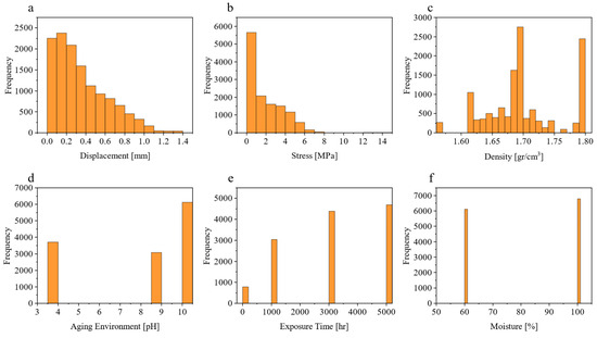 Histogram of the utilized experimental dataset, showing the distribution of: (a) displacement values; (b) stress values; (c) density values; (d) aging environment categories; (e) exposure time durations; (f) moisture values.