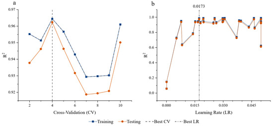 following the process of the experimental results data, they fed into the machine learning model for further analysis. As shown in Figure 7a, the analysis of the model’s performance across different cross-validation folds reveals that the 4-fold cross-validation provided the highest R2 score. However, while 10-fold cross-validation yields a marginally higher accuracy, it requires more computational resources. The decision to use 4-fold cross-validation was made to balance accuracy and efficiency, ensuring robust performance with fewer computational demands. As illustrated in Figure 7b, Bayesian optimization identified an optimal learning rate of 0.01729, achieved at iteration 9 of, resulting in the highest R2 scores for both training and validation sets. This indicates the best generalization performance for the model.