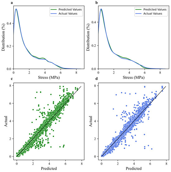 Figure 8 presents a comparative performance analysis of the XGBoost model. The KDE plots for the training (a) and testing (b) datasets reveal a close alignment between the distributions of predicted and actual values, indicating the model’s accuracy in stress prediction. The scatterplots of actual vs. predicted values for training (c) and testing (d) datasets display a strong linear relationship, with the most points closely aligned along the line of perfect fit (diagonal line). The comparison of scatter plots (a and b) suggests that the model is performing remarkably well in terms of predicting stress values based on the selected set of input features. The consistency across training and testing datasets suggests the model’s robustness and reliability, demonstrating its effective generalization from training to unseen data.