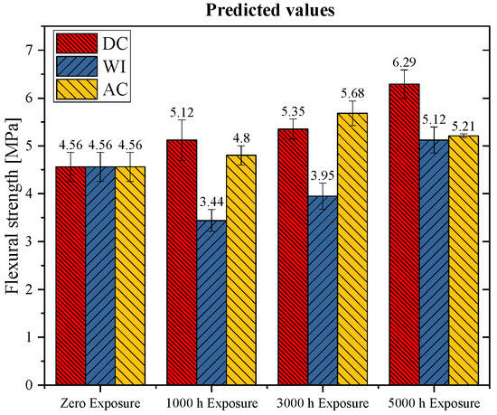 The variation of the flexural strength across different aging media, as determined from the experiments, is shown in Figure 6, while Figure 10 illustrates the corresponding values predicted by the model. Figure 10 illustrates the flexural strength of specimens under zero exposure, 1000-h exposure, 3000-h exposure, and 5000-h exposure across three different environments: DC, WI, and AC. Figure 5 shows a significant variation in flexural strength depending on the aging medium and exposure duration. For instance, the flexural strength of specimens under zero exposure starts at 4.54 MPa for DC, with notable increases or decreases observed at subsequent exposure durations. Specifically, the strength in the DC environment shows a peak at 5000 h with a value of 6.78 MPa, while the WI environment shows a decline over time, indicating the influence of water on material degradation. Conversely, the AC environment maintains a more stable flexural strength over time. The experimental results highlight the importance of environmental factors on the evolution of material properties, which the gradient boosting model aims to predict and interpret with high accuracy. By comparing the experimental data with the model predictions, there would be a better understanding of the reliability and applicability of machine learning in predicting material behavior under various conditions.