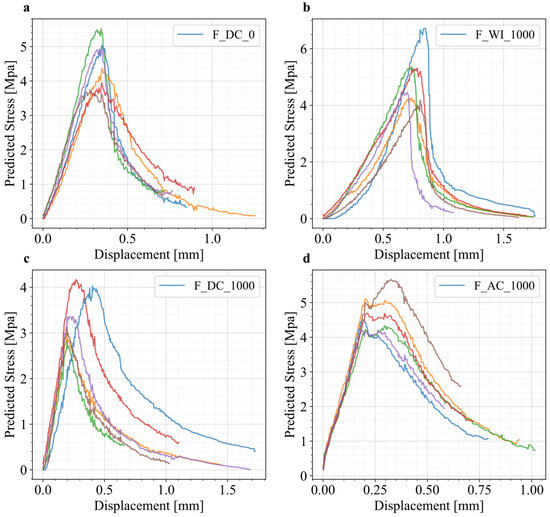 Predicted Stress vs. displacement diagram for each individual specimens from the XGBoost output for: (a) F_0 group; (b) F_DC_1000; (c) F_WI_1000; (d) F_AC_1000.