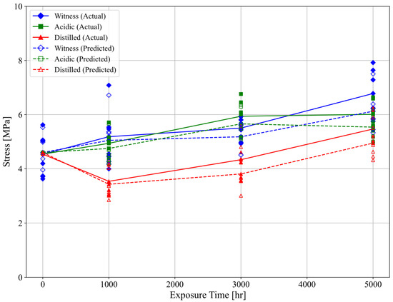 For the F_DC_1000 condition depicted in Figure 5c, the actual stress values rise steadily, reaching a peak around 4.0 MPa at 0.75 mm of displacement. Figure 11c shows the predicted stress values with a similar trend, with the model accurately reflecting the material’s behavior after exposure to distilled conditions for 1000 h. The estimated margin of error for displacement is ±0.1 mm, and for maximum stress, it is about ±0.3 MPa. This consistency further demonstrates the model’s predictive reliability across varied conditions.