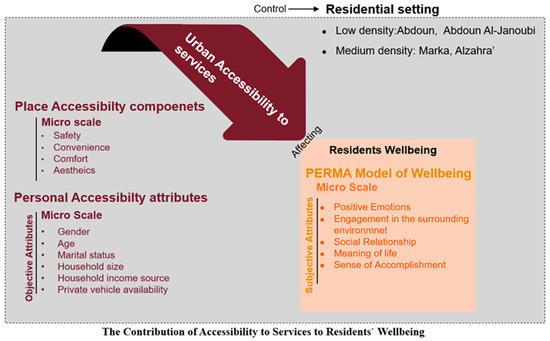 The current literature examines urban and residential service provision, with a particular focus on Amman. It offers definitions of both accessibility and service access, detailing the components of place accessibility at both macro and micro scales. Moreover, it examines various levels of wellbeing, encompassing urban and residential aspects. The discussion extends to models and measures of residents’ wellbeing, incorporating both subjective and objective indicators. Finally, this section presents the conceptual framework employed in the study to assess how accessibility to services influences residents’ wellbeing within the chosen residential contexts.