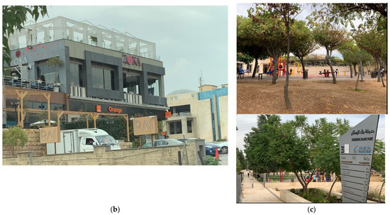(a) Abdoun Al-Janoubi residential setting in relation to Amman city. (b) Sample of commercial buildings. (c) Sample of social facilities. Source: Researchers, 2024.