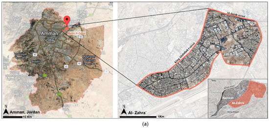 2. Marka Al-Shamaleyeh: One of the oldest neighborhoods in East Amman, inhabited after the “Six Day War” in 1967, and part of the Marka district. It includes two clusters, Hamzeh and Al-Zahra, with Al-Zahra being the focus due to its high population density and homogeneity. Al-Zahra spans 2.7 square kilometers with a population of 42,005 and a density of 15,557 persons per km2. It hosts 8937 households typified by low- and middle-income housing, as shown in Figure 3.