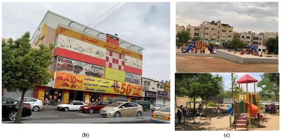 (a) Marka residential setting in relation to Amman city. (b) Sample of commercial buildings. (c) Sample of social facilities. Source: Researchers, 2024.