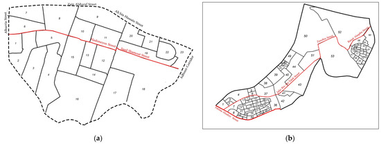 (a) Blocks within Abdoun Al-Janoubi neighborhood. (b) Blocks within Zhara’ neighborhood. Source: Researchers, 2024. Note: the numbers inside the lots represent lot number according to land planning Department. Data were extracted from the Department of Statistics (2020).