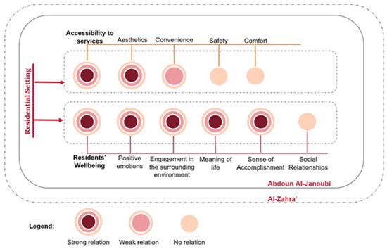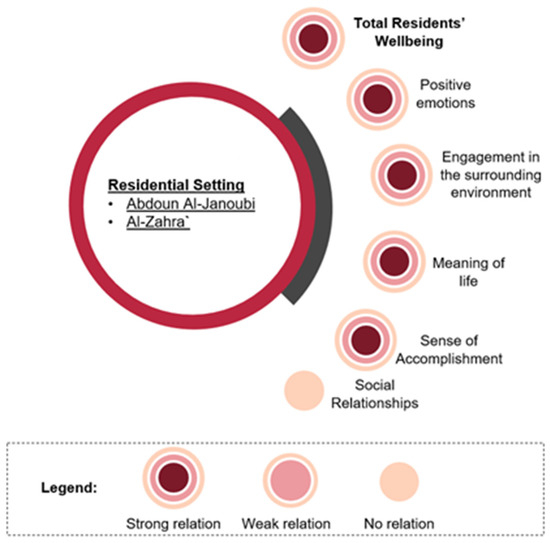 - Total residents’ wellbeing was defined by positive emotions, social relationships, engagement in the surrounding environment, meaning of life, and sense of accomplishment.