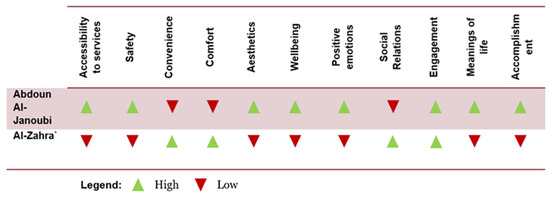 The societal fabric of cities is composed of a rich array of opportunities, such as employment, education, and cultural experiences. Cities cultivate environments conducive to social interaction, creativity, and physical activity, addressing fundamental human needs for recreation, self-expression, and sensory engagement [28]. Thus, providing adequate neighborhood facilities is crucial for the ongoing ability of communities to live, work, and socialize effectively. Early urban planning scholars emphasized the importance of pedestrian transportation and walkability within neighborhoods, noting that these factors can significantly enhance residents’ physical activity and overall health [29]. As highlighted during the Rio Earth Summit through Agenda 21, achieving sustainable communities hinges on offering residents quality housing, employment, and opportunities for social interaction, ultimately promoting equity and empowerment [30].