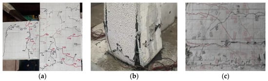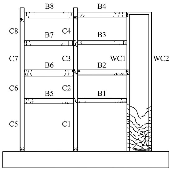 - When the PGA was 0.8 g, the pre-existing cracks further developed. At the shear wall base, an inclined crack at an approximate 15° angle reached a maximum width of 1 mm, while another horizontal flexural crack significantly widened, reaching a maximum width of 2 mm. The strains in the shear wall rebars also showed significant increases, and a portion of the concrete at the base was crushed and spalled. In addition, wide cracks also appeared at the intersections of WC2 with B3 and B4, and yielding strains were observed in the rebars located at the right ends of both B4 and B7.