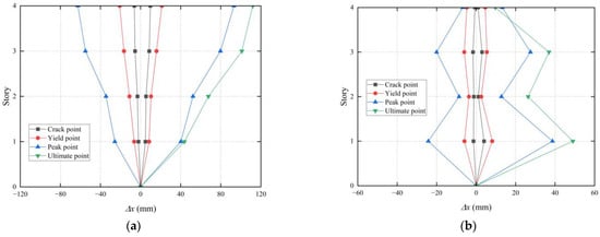- Unlike the deformation pattern resembling a wine barrel shape in the lateral frame structure of TPPs, as the specimen shifts from elastic to plastic behavior, the flexural–shear deformation of this longitudinal frame–shear wall structure gradually transitions from being dominated by flexure to being dominated by shear.