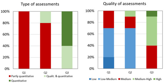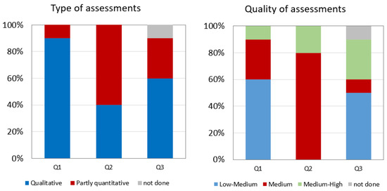 Looking into the number of references, Q1 and Q2 are rather similar, but this number goes down in Q3 slightly. In some cases, the recommendations do not include references, unless you ask the AI tool repeatedly; these additional references are not taken into account for the global result but are presented to show how the AI tool’s potential is limited in some cases. The references given correspond to general guides or websites of public institutions or companies, not specific study results or applicable measures. In detail, the average Q1 answers involve 1.2 guides/reports, 2.3 institutions, 1.0 scientific papers, and 0.1 unclear publications. On average, Q2 shows 1.8 guides/reports, 1.9 institutions, 0.1 scientific papers, and 0.1 unclear references. On average Q3 indicates 2.7 guides/reports, 1.3 institutions, and 0.7 scientific papers.