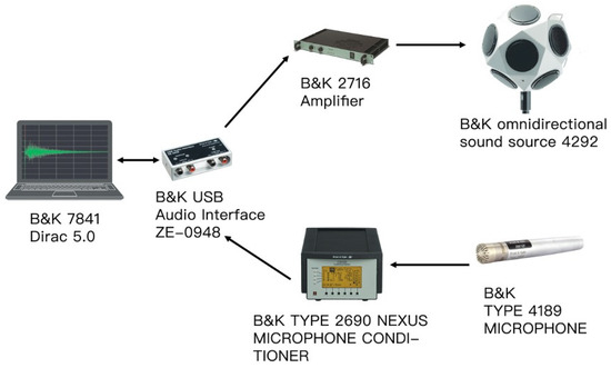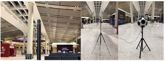 In compliance with ISO 3382-2:2008 [39], this study employed a dodecahedral sound source B&K 4292 (powered by B&K 2716 amplifier), centrally positioned in each departure lounge. The audio signals were received by a B&K 4189 omnidirectional microphone, amplified via the B&K 2690 NEXUS microphone conditioner, and subsequently collected using the B&K USB audio interface sound card, enabling the transfer to a computer. Following this, the signals underwent deconvolution processing employing Dirac 5.0 software, yielding impulse response data ready for analysis. The configuration of the experimental apparatus is illustrated in Figure 3, detailing the setup of the audio capture and processing equipment used in the study. Specific acoustic parameters, such as EDT, T30, and D50, were calculated from these impulse responses. Appendix A, Table A1, provides detailed dimensions (length, width, height) of Piers A and B, along with the average absorption coefficient at 1000 Hz. Additionally, it includes the average EDT and T30 within the octave bands centered at 500 Hz and 1000 Hz, as well as the average D50 across four octave bands centered at 500 Hz and 4000 Hz. The selection of these specific octave bands aligns with established studies [27,40], enhancing the robustness and comparability of the research findings.