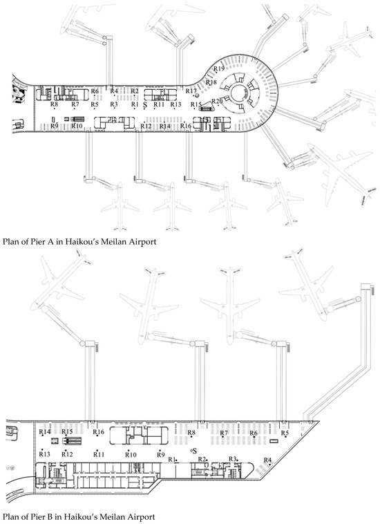 Impulse response measurements were conducted in two architecturally distinct departure lounges at Haikou Meilan International Airport (HAK), designated as Lounge A and Lounge B. Lounge A features a dual-sided pier configuration, with a total length of 220 m, a base width of 40 m, and an expanded terminal width of 60 m. Its roof design includes an arched structure reaching a central height of 12 m and sloping to 8.2 m at the sides. The floor area is 10,286 m2, the surface area is 20,783 m2, and the volume is 98,099 m3. The lounge incorporates longitudinal skylights and accommodates eight boarding gates. The average sound absorption coefficient of the pier-style concourse is 0.11. In contrast, Lounge B adopts a single-sided pier design. It has a length of 160 m, a consistent base width of 40 m that tapers to 32 m at the terminal. Like Lounge A, it also features an arched roof, with a minimum height of 8.2 m and a maximum height of 12 m. The floor area is 5565 m2, the surface area is 87,495 m2, and the volume is 60,414 m3. This lounge includes central skylights and has four boarding gates, with an average sound absorption coefficient of 0.11. Objective measurement photographs illustrating the acoustic environments of each lounge are displayed in Figure 1. In Pier A, twenty receiver points are strategically distributed to maximize data coverage and accuracy; Pier B includes sixteen receiver points. The placement of receivers and sound sources, depicted in Figure 2 with ‘R’ marking the receiver locations and ‘S’ the signal sound sources, complies with ISO 3382-2:2008 standards [39].