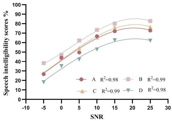 The SNR and room acoustic parameters are pivotal determinants of speech intelligibility. In this study, subjective speech intelligibility scores were gathered from four listening positions within the simulated environment of the departure lounge, under various SNRs ranging from −5 dB(A) to 15 dB(A) and in a noise-free condition. These results are displayed in Figure 4. Analysis of the data demonstrates a robust positive correlation between speech intelligibility and SNR at each of the listening positions, indicating that speech clarity scores improve as SNRs increase. This correlation is quantitatively modeled through a third-order polynomial fit, with determination coefficients (R-squared values) reported as 0.98, 0.99, 0.99, and 0.98, respectively, underscoring the strong predictive power of the SNR in assessing speech intelligibility across diverse acoustic settings.