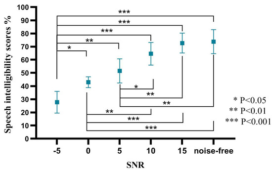 Figure 5 presents a detailed analysis of the experimental data, showcasing the mean values and standard deviations of speech intelligibility scores within pier-style departure lounges under various SNR conditions. A one-way Analysis of Variance (ANOVA), conducted using SPSS 26.0, revealed a significant impact of SNR on speech intelligibility within these acoustic environments (F = 20.808, p < 0.001). Further insights from post hoc analysis using the Least Significant Difference (LSD) test are also depicted in Figure 5. This analysis highlights that under lower SNR conditions (−5, 0, and 5 dB(A)), speech intelligibility scores are significantly reduced compared to higher SNR conditions (10, 15 dB(A), and noise-free). Additionally, the analysis indicates no significant variance in speech intelligibility scores among the higher SNR settings (10, 15 dB(A), and noise-free). These findings imply that speech intelligibility improves markedly as SNR increases up to 10 dB(A); however, increments beyond this threshold do not contribute significantly to further enhancements in speech clarity. This observation aligns with previous study [25] in conventional rectangular spaces, varying from 342 to 41,656 m3 in volume. For larger rectangular spaces, approximately 97,000 m3 in size, the research in [27] identifies a critical threshold of 14.4 dB(A).