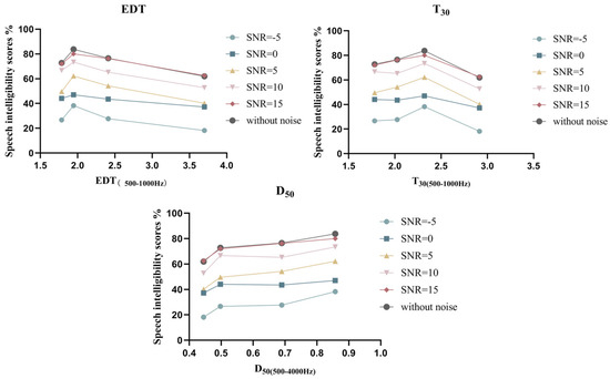 The relationship between speech intelligibility scores of different SNRs and T30, EDT and D50 in pier-style departure lounges.