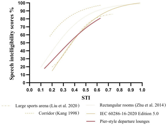 To assess the applicability of the STI in large, elongated spaces such as pier-style departure lounges, this study evaluates the correlation between STI and speech intelligibility scores across diverse architectural configurations and sizes. The findings are analyzed in conjunction with the revised STI–speech intelligibility curve [56] from the 2020 edition of the IEC 60268-16 standard [35], as depicted in Figure 8. The study selected a large sports arena with a volume of 97,000 m3 [27] as a representative of large rectangular spaces, comparing it against a modeled and measured pier-style departure lounge with a volume of 100,000 m3. Additionally, a pair of conventional-sized rectangular and elongated spaces were chosen as control groups; conventional rectangular spaces included office and classroom environments ranging from 108 to 1674 m3 [21], and the conventional elongated space was an architectural corridor measuring 109 m3, with dimensions of 25.3 m by 1.86 m by 2.34 m [24]. It is important to note that while the IEC 60268-16 standard utilizes an English PB word list, all other evaluations in this research use a Mandarin PB word list for subjective speech intelligibility assessments.