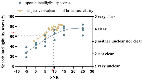 The relationship between SNR and both speech intelligibility scores and subjective evaluations of broadcast clarity.